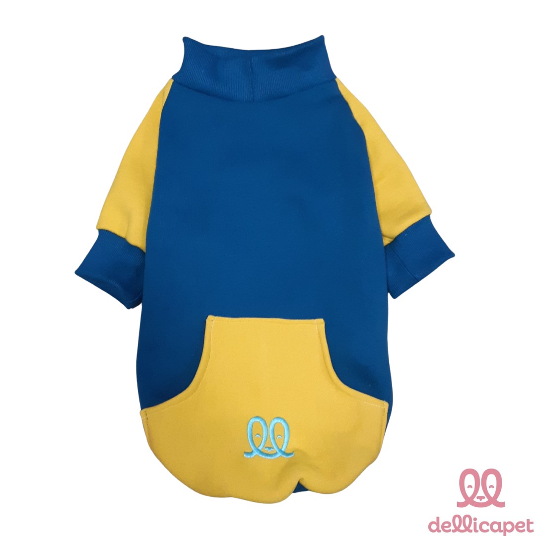 Roupinha de Inverno com mangas e bolso - em tecido moletom, super quentinho e confortável, na cor azul petróleo com amarelo mostarda.