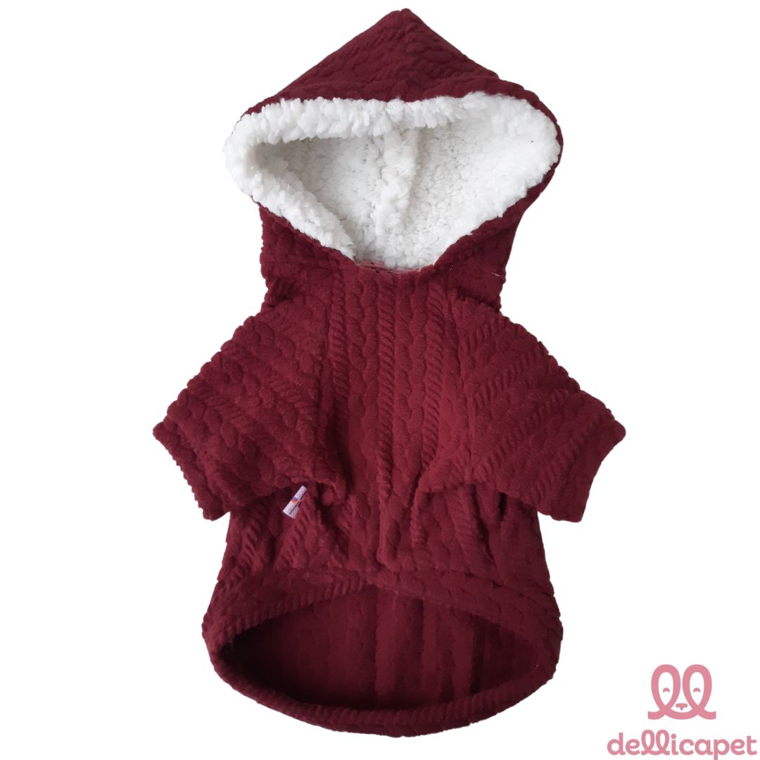 Roupinha de Inverno com mangas e capuz - em tecido microsoft, super quentinha e confortável, na cor bordô com textura de tricot.