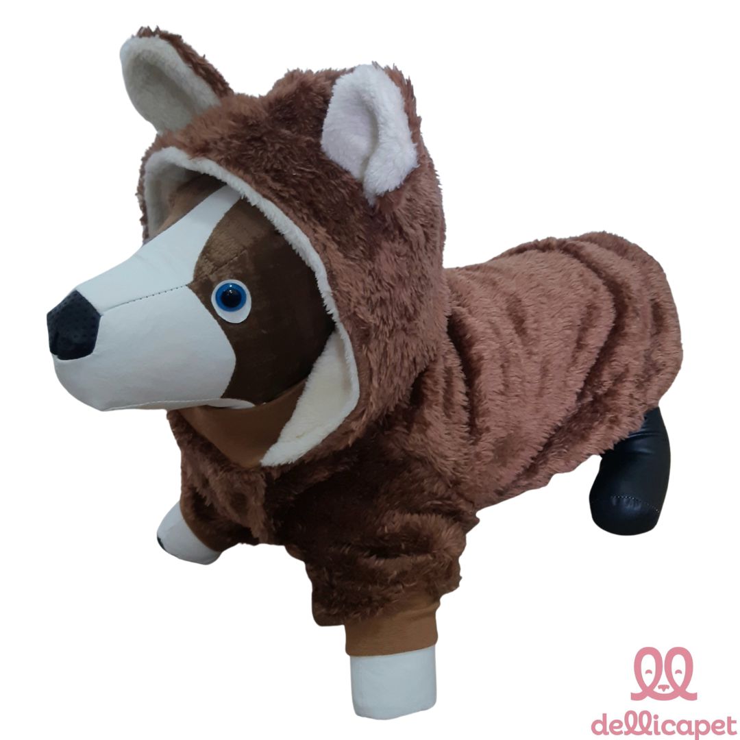 Roupinha de Inverno com mangas e capuz - em tecido pelúcia Teddy, super quentinha e confortável, na cor marrom e bege.