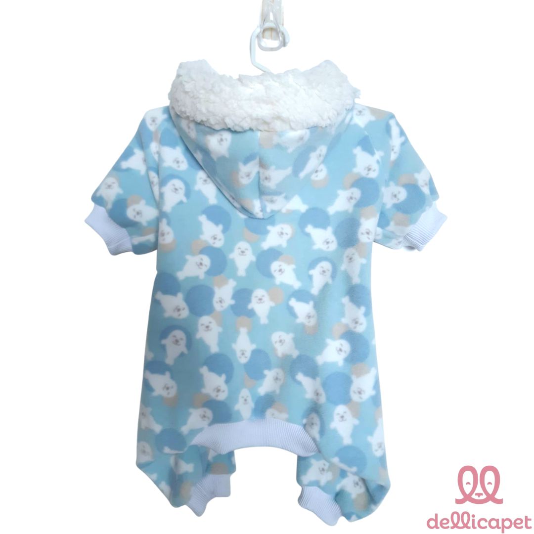 Macação de Inverno com capuz - em tecido microsoft, super quentinho e confortável, na cor azul claro com estampa de foquinhas.