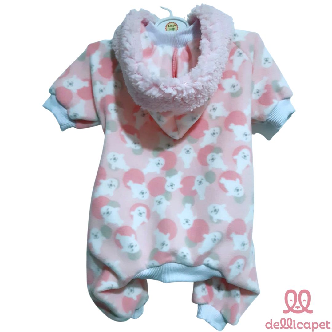 Macação de Inverno com capuz - em tecido microsoft, super quentinho e confortável, na cor rosa claro com estampa de foquinhas.