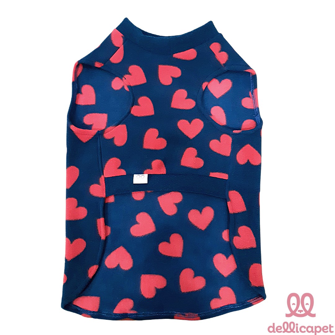 Roupinha de Inverno em tecido Microsoft, sem mangas, super quentinha e confortável, na cor Azul Marinho com corações em vermelho.