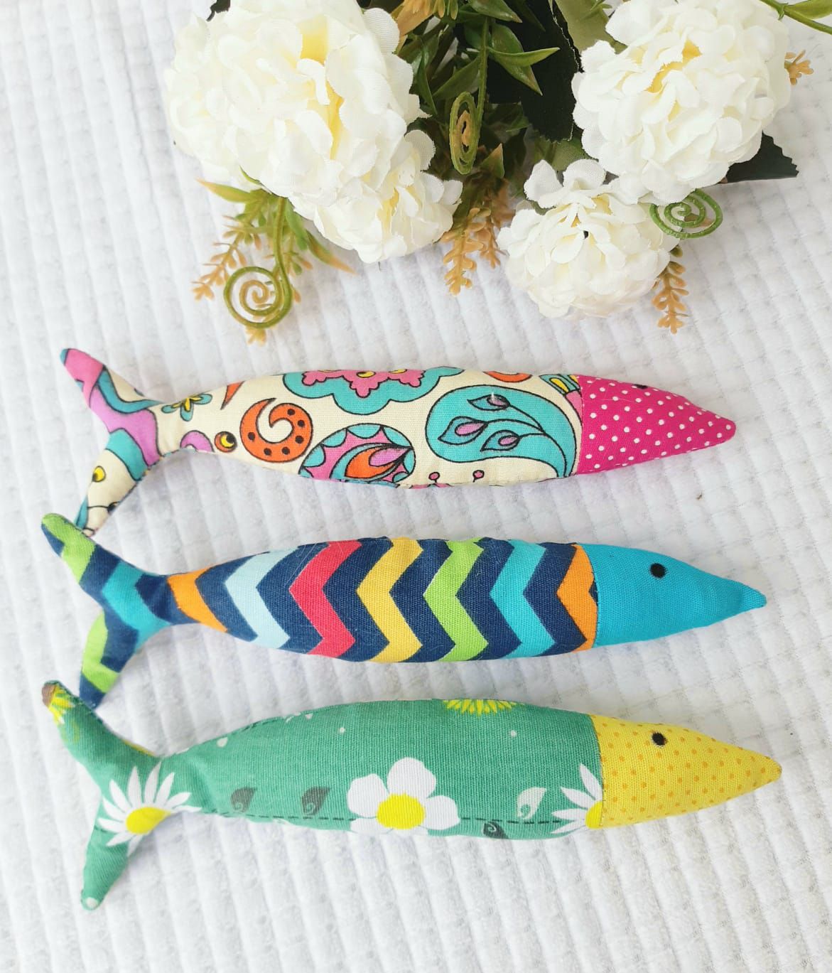 Sardinhas super coloridas de tecido, recheadas com Catnip, para diversão do seu gatinho!