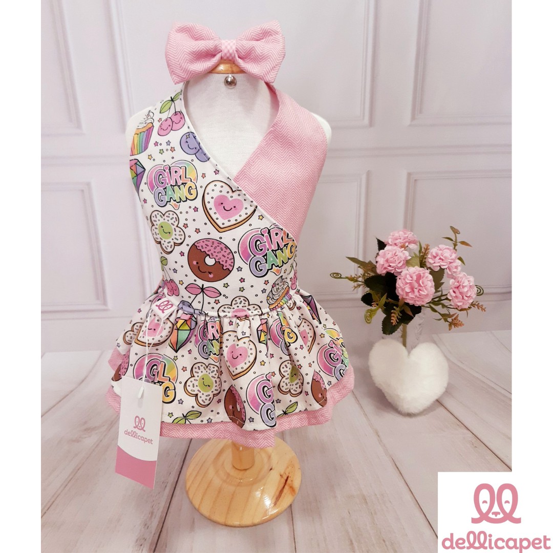 Lindo Vestido rosa no tema "Girl Gang" , no modelo transpassado com saia dupla. Fechamento no pescoço com botões de pressão e na barriga com velcro, regulável.